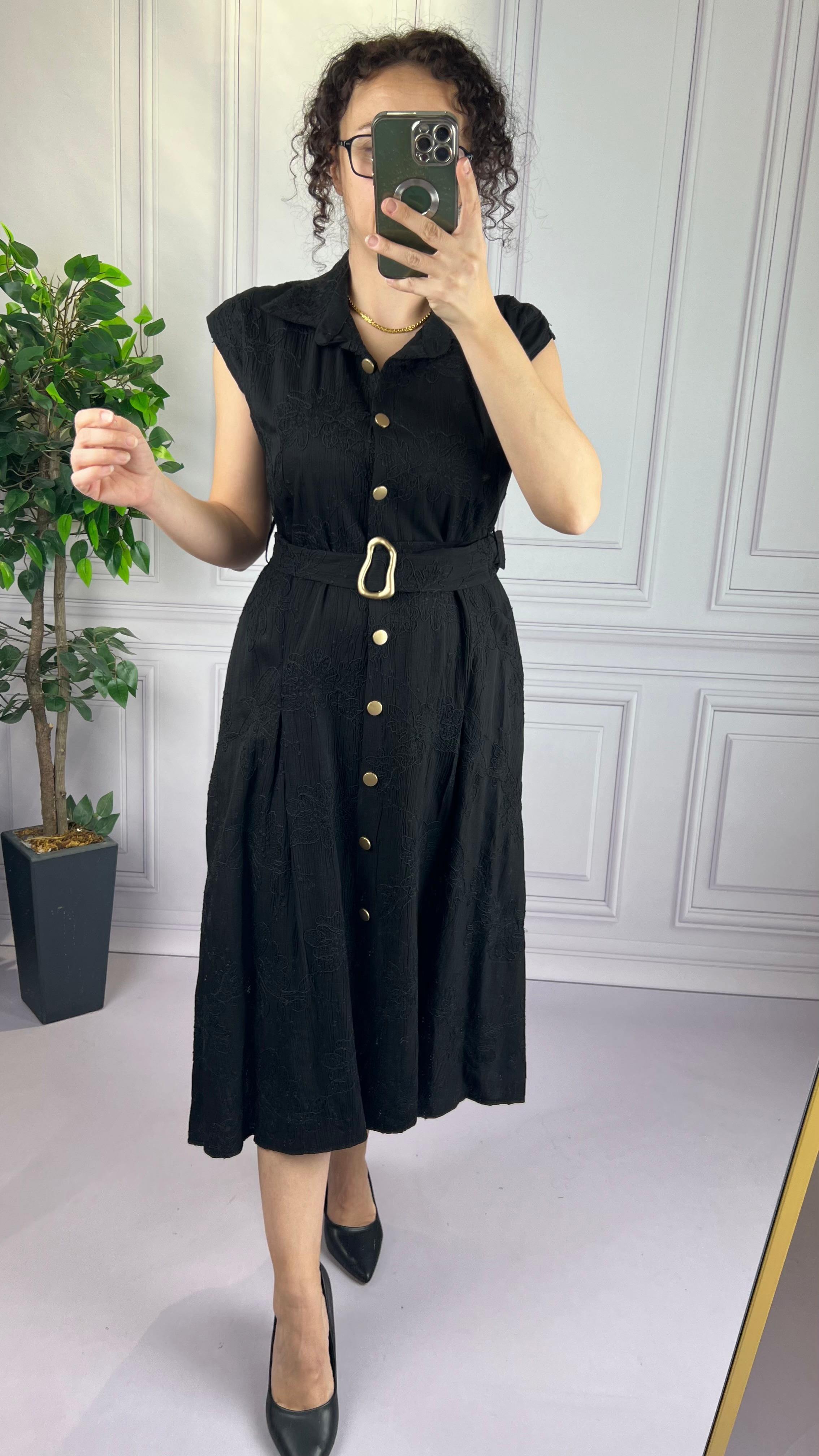 NAKIŞLI ,DÜŞÜK OMUZLU, CEPLİ PİLİKAŞELİ MİDİ BOY KEMERLİ ELBİSE...